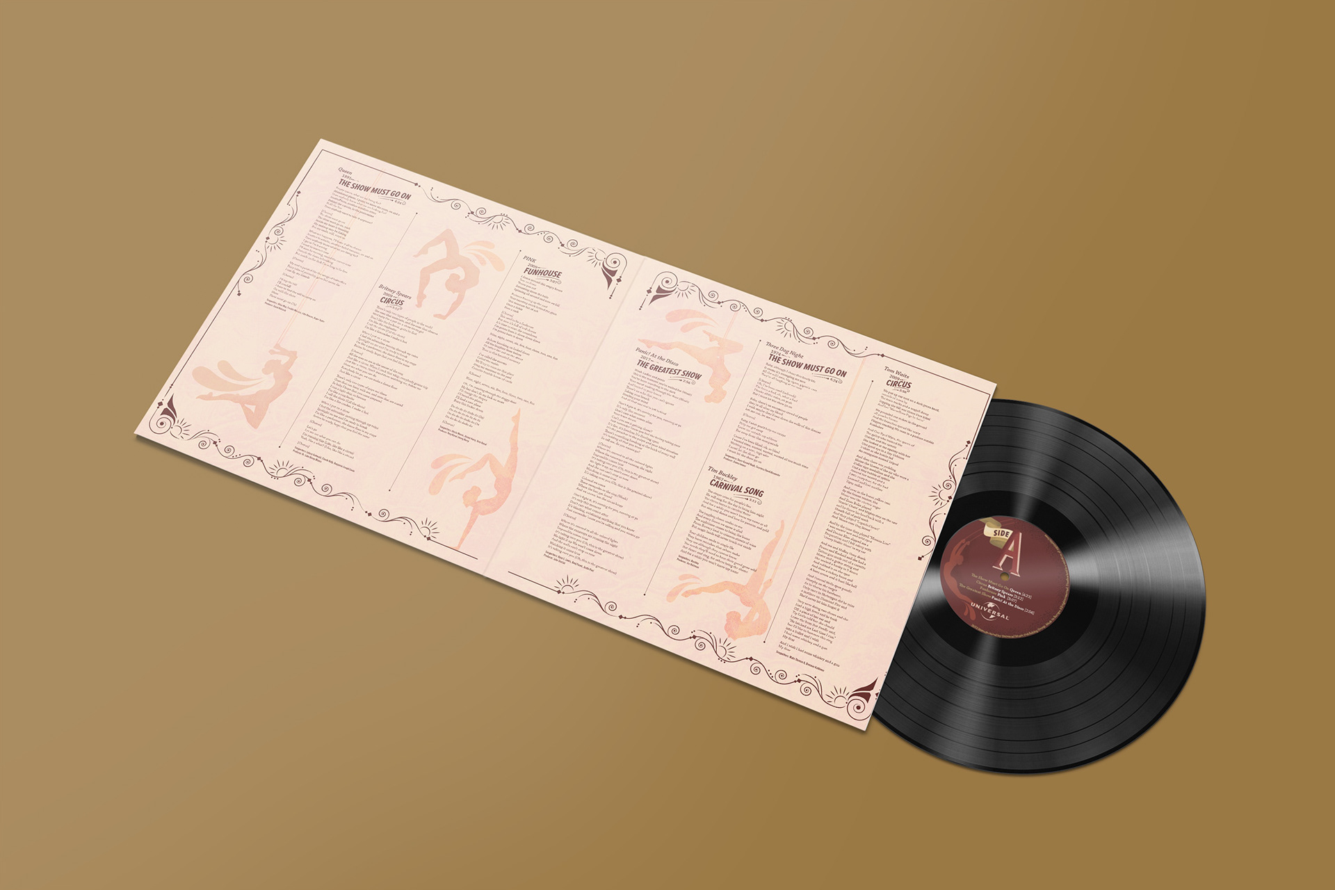 In support of the School of Acrobatics and New Circus Arts’ (SANCA) mission of improving the mental, emotional, and physical health, this limited-edition vinyl album was produced to promote the creativity of the acrobatic arts while celebrated the 50th anniversary of the Cirque Du Soleil. By taking hit songs surrounding circus themes, the goal of this album is to showcase a playlist of the very best while celebrating one of the greatest performing art companies out there. The hand done typography is the focus throughout while acrobatic figures are swinging across creating a dynamic flow.